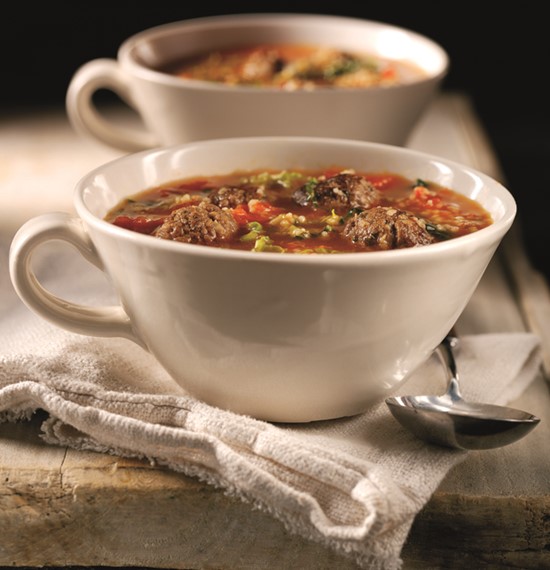 Hearty warming meal in a bowl for hungry mouths. Beef mince meatballs cooked in a tomato based soup with couscous.