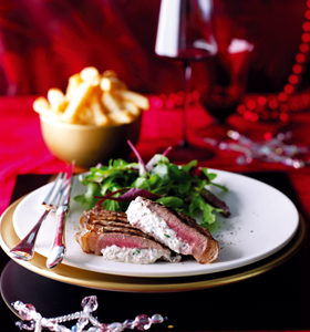 - Divide the potato mixture between two serving plates. Slice the steak on the diagonal and arrange on top of the potatoes. Drizzle over the red wine sauce and serve immediately with a red chicory salad.
